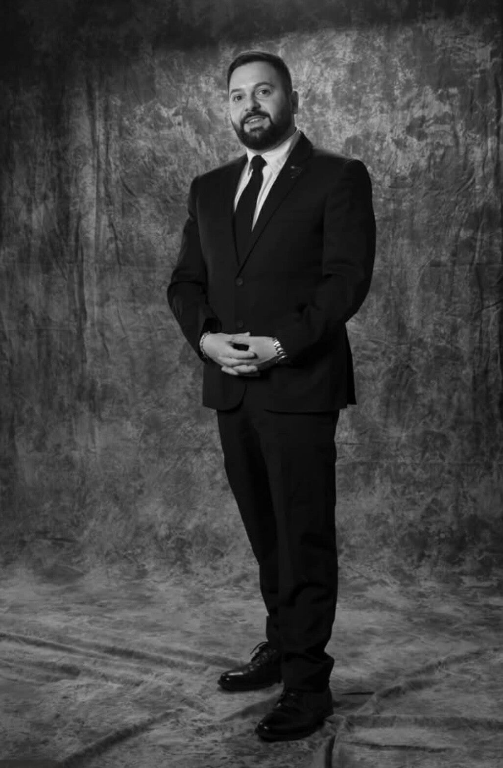 - Professional suit and tie appearance